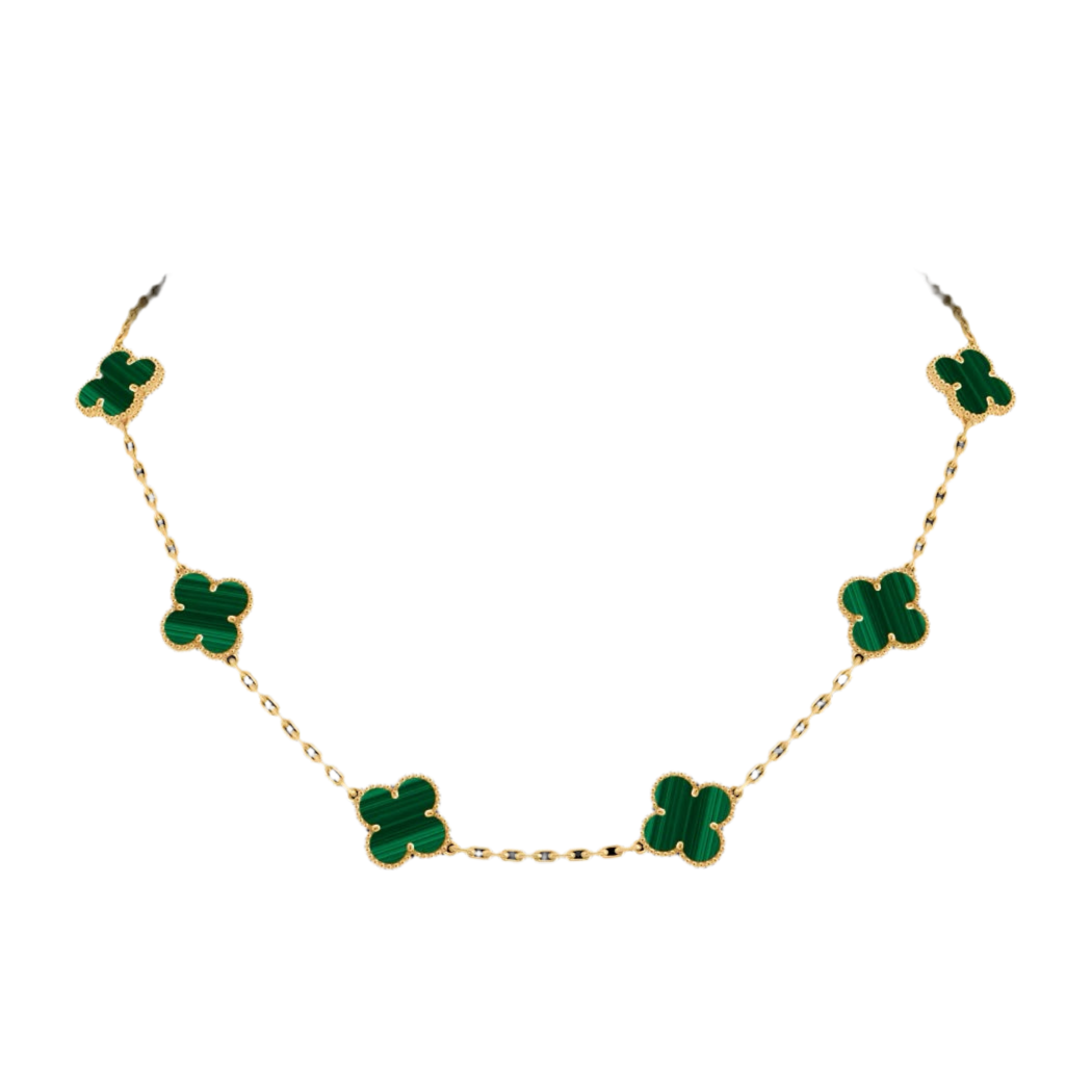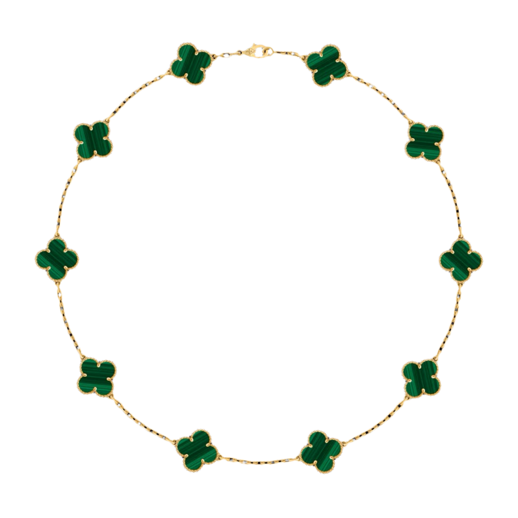 Colierul Van Charm cu cele 10 elemente decorative in forma de trifoi este o bijuterie elegantă și simbolică, inspirată de faimosul design cu trifoi („clover”), o emblemă a norocului și eleganței. Realizat din oțel inoxidabil de înaltă calitate, placat cu Rodiu, acest pandantiv are margini delicate perlate care îi conferă farmecul clasic al colecției „Vintage Clover”.
