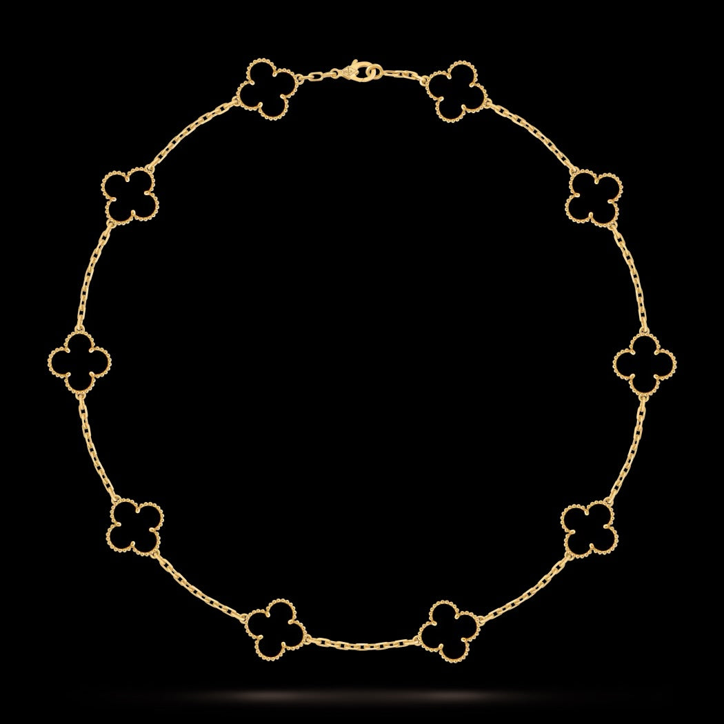 Colierul Van Charm cu cele 10 elemente decorative in forma de trifoi este o bijuterie elegantă și simbolică, inspirată de faimosul design cu trifoi („clover”), o emblemă a norocului și eleganței. Realizat din oțel inoxidabil de înaltă calitate, placat cu Rodiu, acest pandantiv are margini delicate perlate care îi conferă farmecul clasic al colecției „Vintage Clover”.