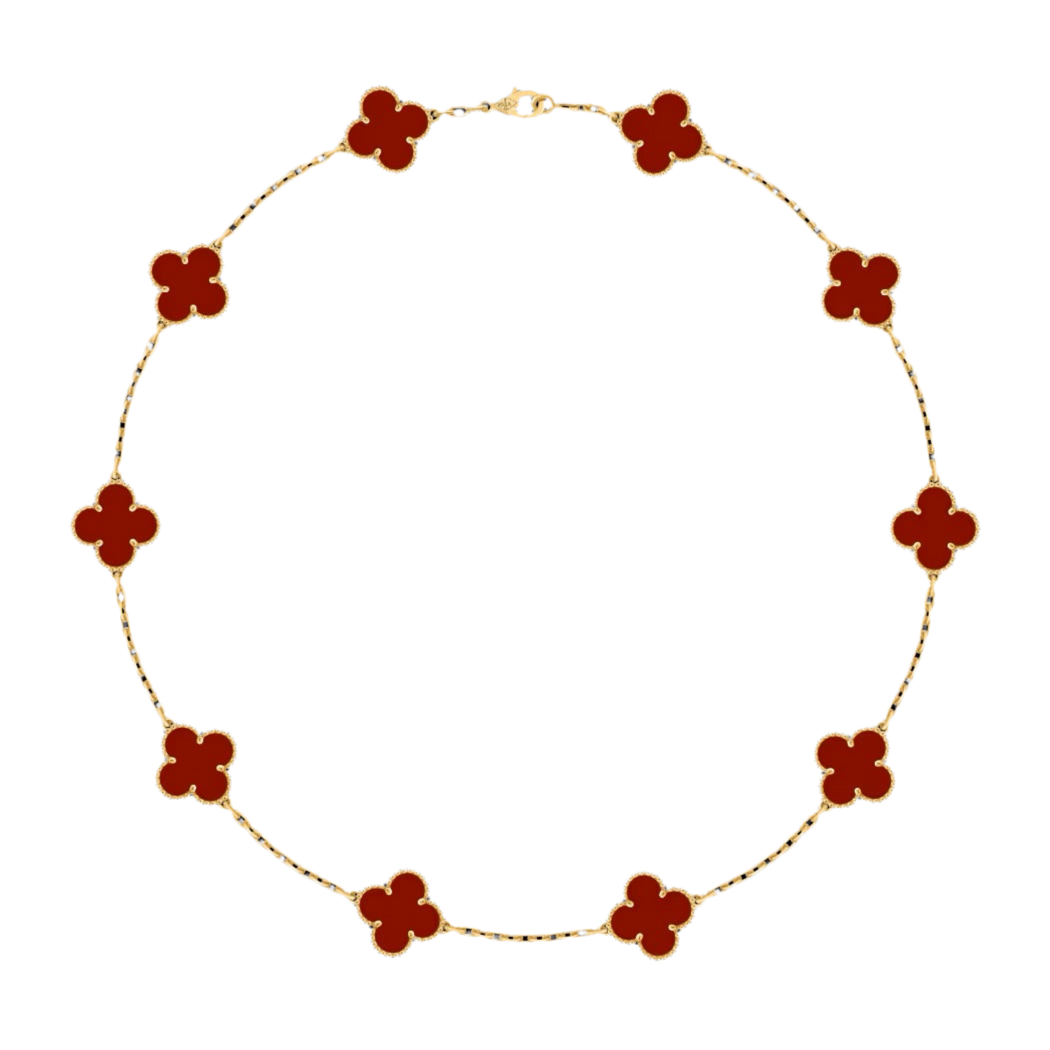 Colierul Van Charm cu cele 10 elemente decorative in forma de trifoi este o bijuterie elegantă și simbolică, inspirată de faimosul design cu trifoi („clover”), o emblemă a norocului și eleganței. Realizat din oțel inoxidabil de înaltă calitate, placat cu Rodiu, acest pandantiv are margini delicate perlate care îi conferă farmecul clasic al colecției „Vintage Clover”.
