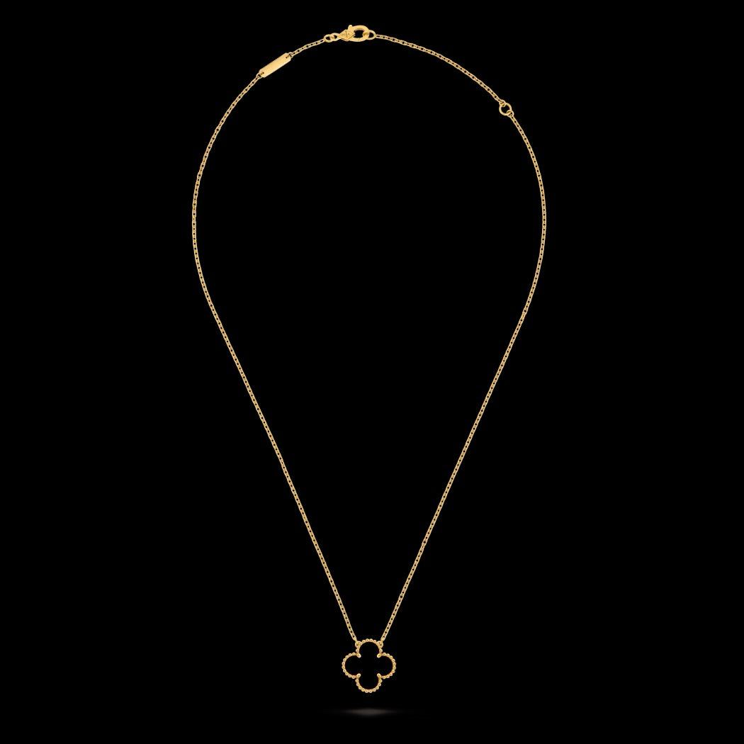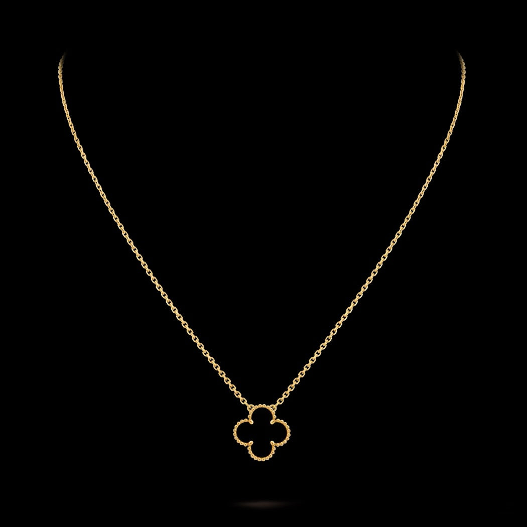 Pandantivul Van Charm este o bijuterie elegantă și simbolică, inspirată de faimosul design cu trifoi („clover”), o emblemă a norocului și eleganței. Realizat din oțel inoxidabil de înaltă calitate, placat cu Rodiu, acest pandantiv are margini delicate perlate care îi conferă farmecul clasic al colecției „Vintage Clover”.
